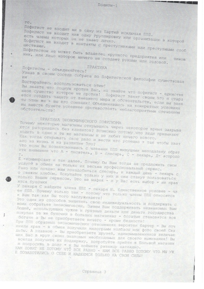 Избегать денег непросто, требуется воля, но это радостно и естественно! Представьте себе первобытных, чистых душой людей каменного века! Ну и зачем им, существам света и природы, несуразные металлические кружочки или бумажки с надписями? Нет власти денег — нет распрей, криминала, войн. Нет лжи и обмана! Верите вы или нет, наше «дитя» — «ППП» — возникло от простого лозунга: «мне пофиг, потому что я самодостаточен и профи в своём деле». Большинство «пофигистов» могли делать что-то своими руками и не хотели платить за свой труд налоги системе, которая паразитирует на свободном труде в обмен на печать ассигнаций.