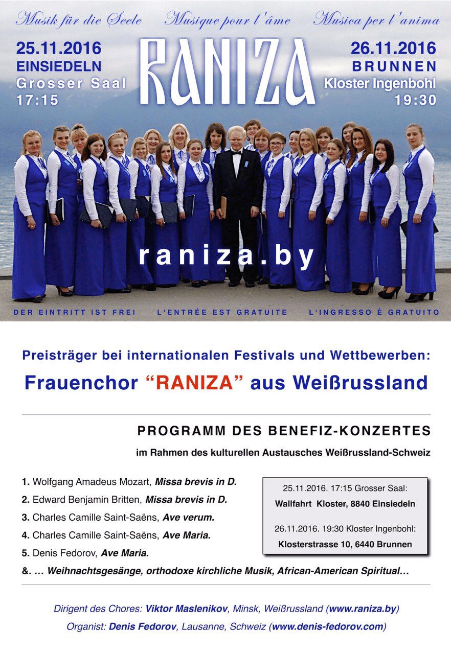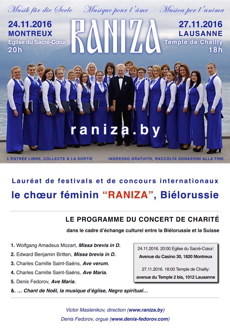 В конце ноября в Швейцарии состоятся благотворительные концерты Народной хоровой капеллы из Беларуси «Ранiца». Гастроли проходят в рамках культурного обмена Беларусь-Швейцария в городах: Монтрё, Айнзидельн, Бруннен, Лозанна.